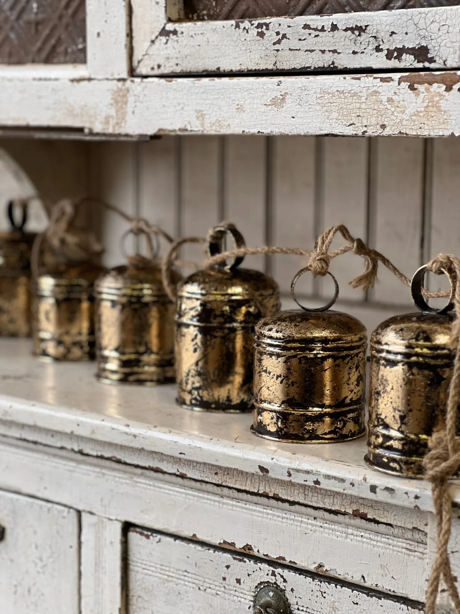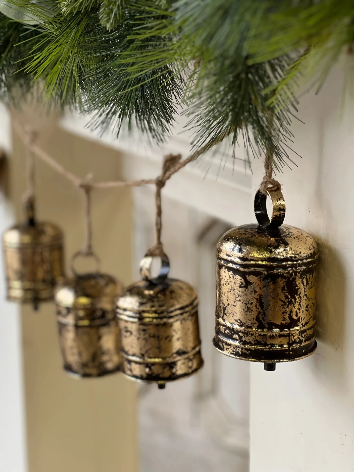 Shiny bells with the most alluringly distressed patina make a resounding statement anywhere they are displayed. Features three different sizes of bells: 6″, 5.5″ & 4.75″ height.