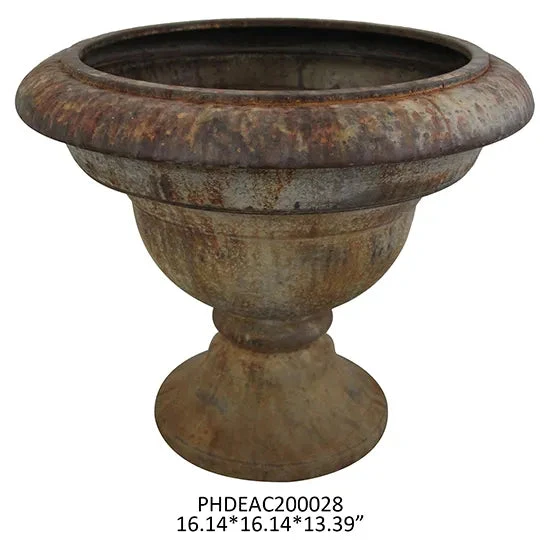 This aged metal garden urn with a low profile makes it perfect for a planter or that special floral arrangement.