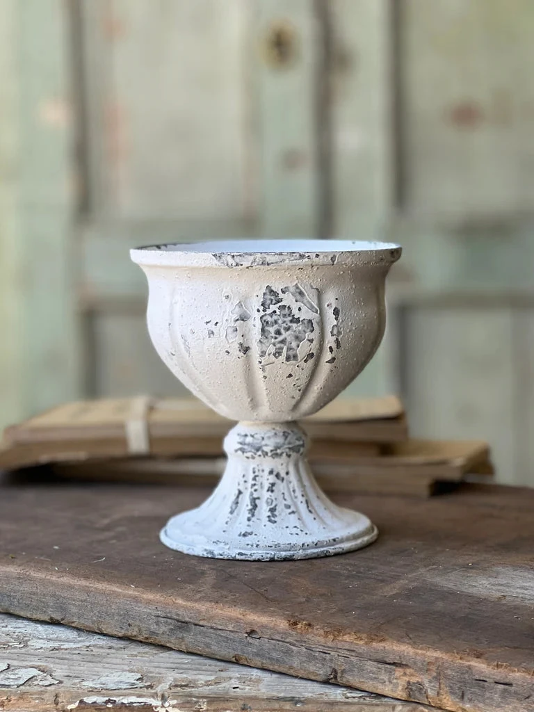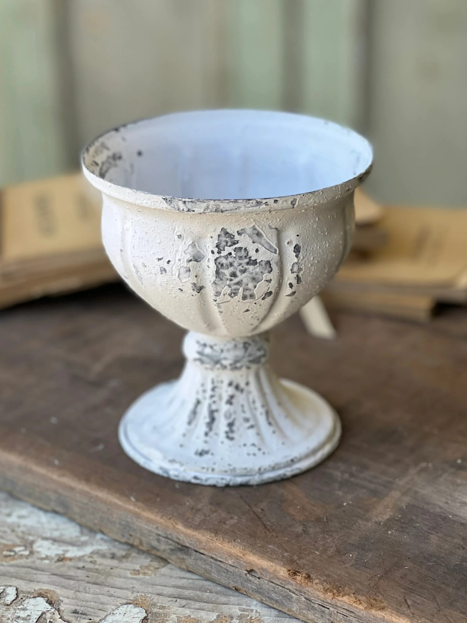 A small goblet with pretty fluting along the base and sides that features a perfectly distressed finish. Extremely versatile and easy to accessorize.
