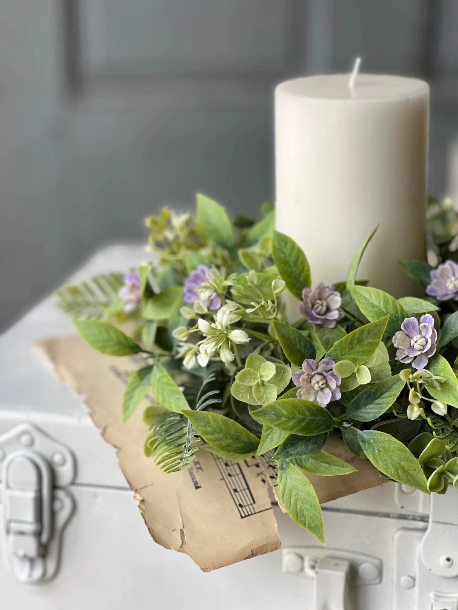 The Blanche Blooms are sweet and exude a winsome air with their pretty tonal greenery, blooms and dash of ferns. Â Has a light powdered finish. Â