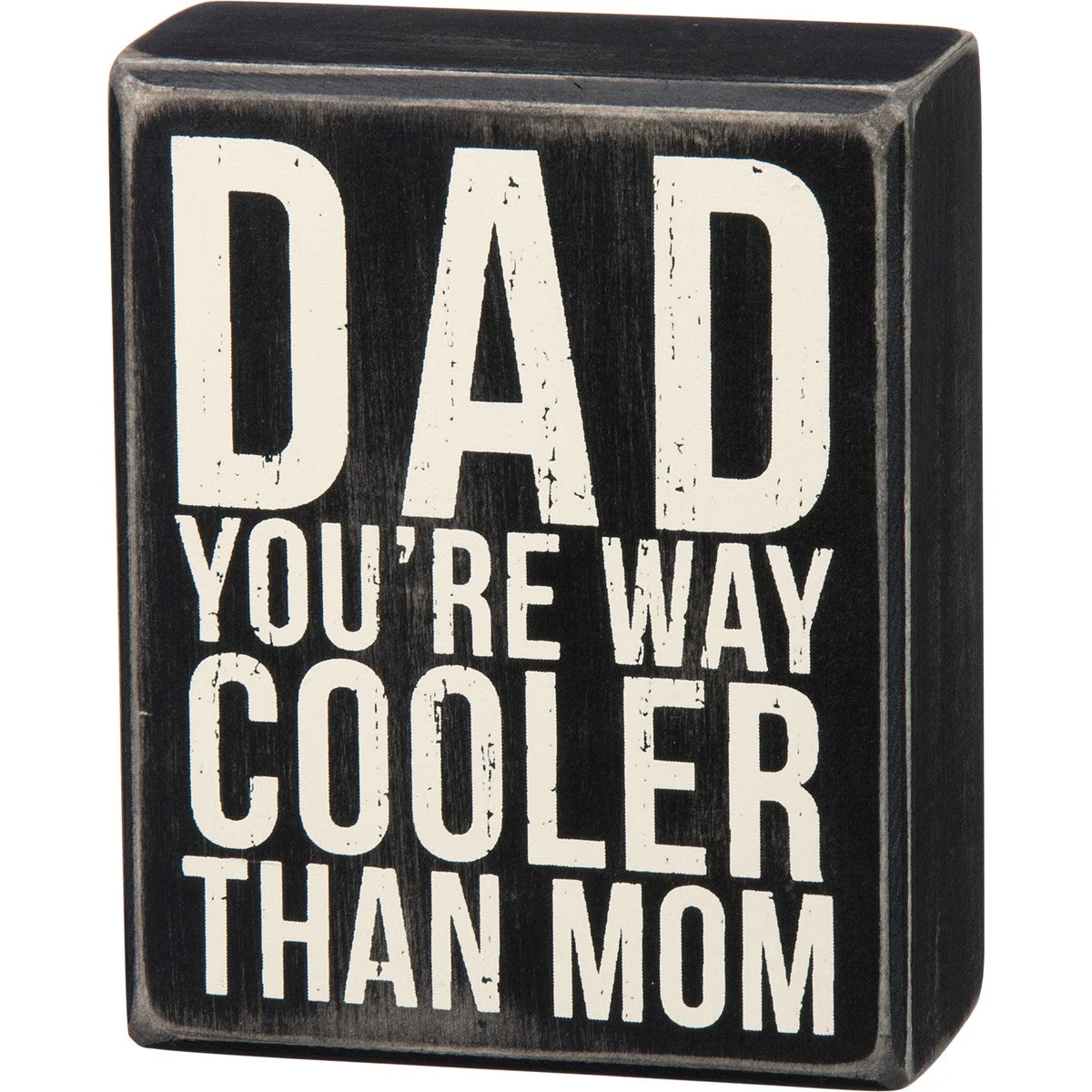 A classic black and white wooden box sign featuring a distressed “Dad – You’re Way Cooler Than Mom” sentiment. Easy to hang or can free-stand alone.