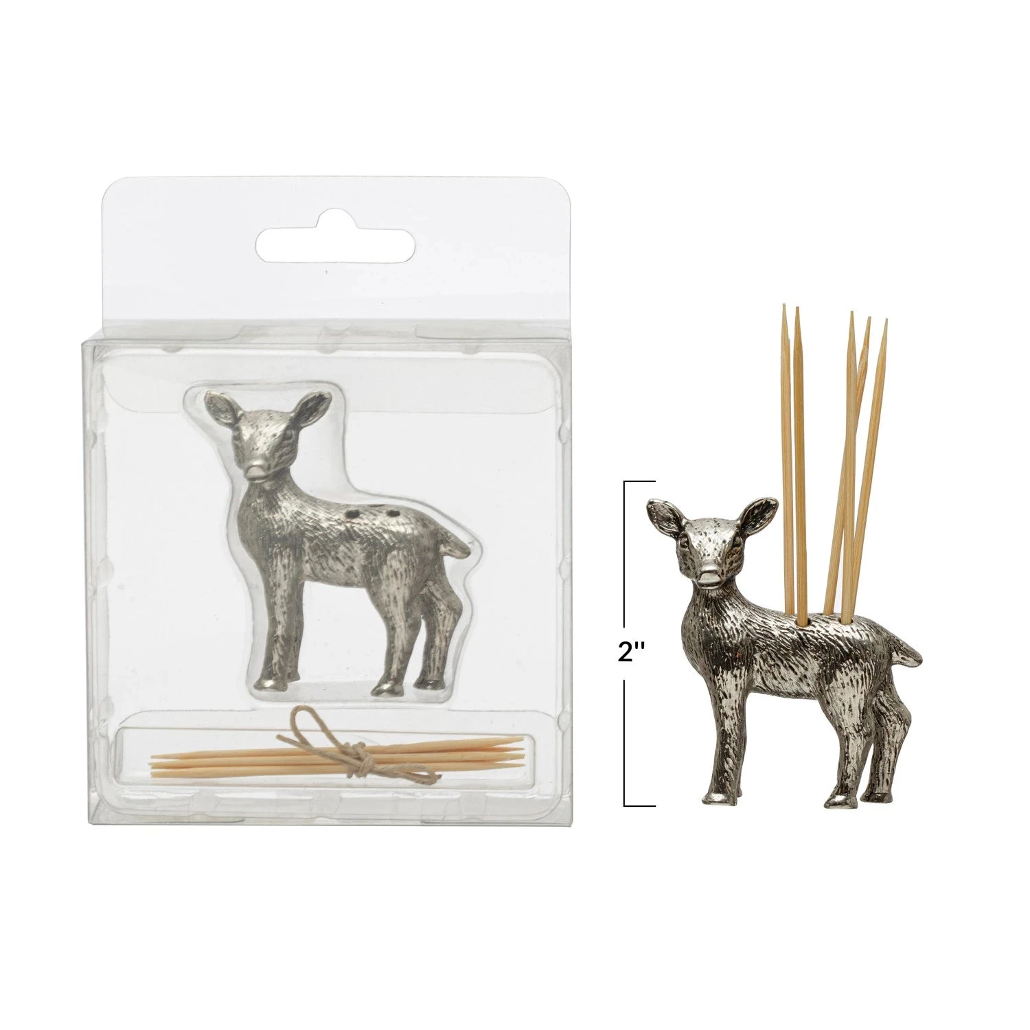 Add a touch of rustic charm to any table setting with this pewter deer toothpick holder, featuring a cute deer design and including 6 toothpicks. Elevate holiday gatherings with our exquisite collection of festive entertaining tools, including napkin rings, bottle openers, and more, designed to inspire seasonal celebrations.