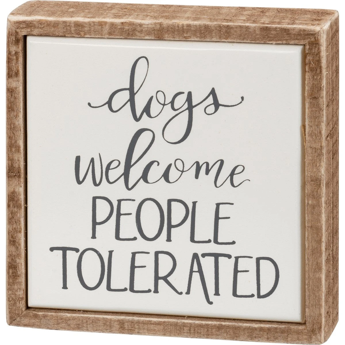 A wooden box sign mini featuring a hand lettered “Dogs Welcome People Tolerated” sentiment and tile-like enamel finish for added appeal. Easy to hang or can free-stand alone.