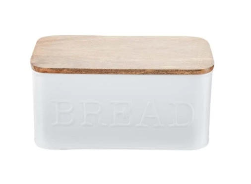 Enamel coated embossed metal bread box with removable mango wood lid.