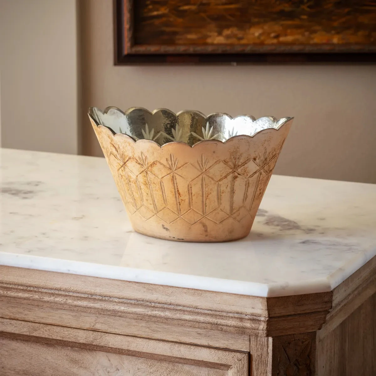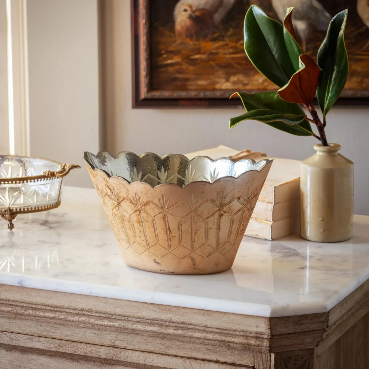 The oblong and wide opening increases the brilliance of the highly reflective interior of this vessel and adds to the contrast with the aged and detailed exterior surface.
