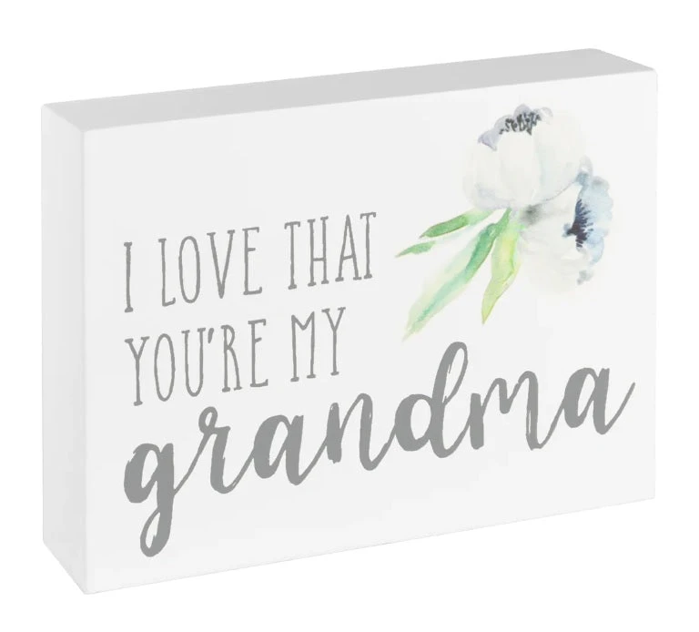 White Wood Block Sign, Gray Text and Floral Artwork.