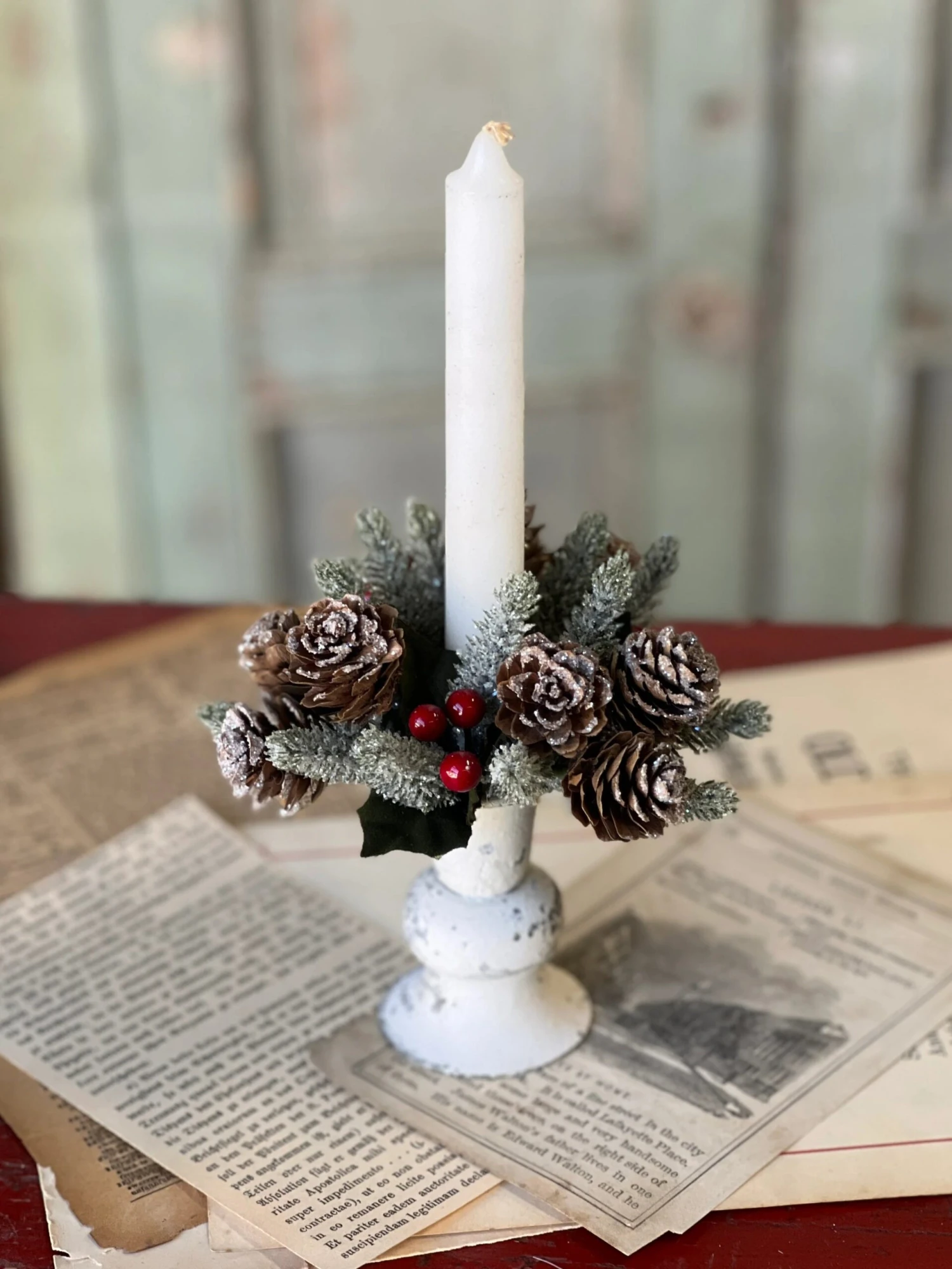 Popular and petite, the Icy Berries & Cone collection is a beautiful mix of pine, pinecones, red berries, and holly shaped leaves dusted with snow, glitter and mica for a wonderfully wintry effect.ย ย