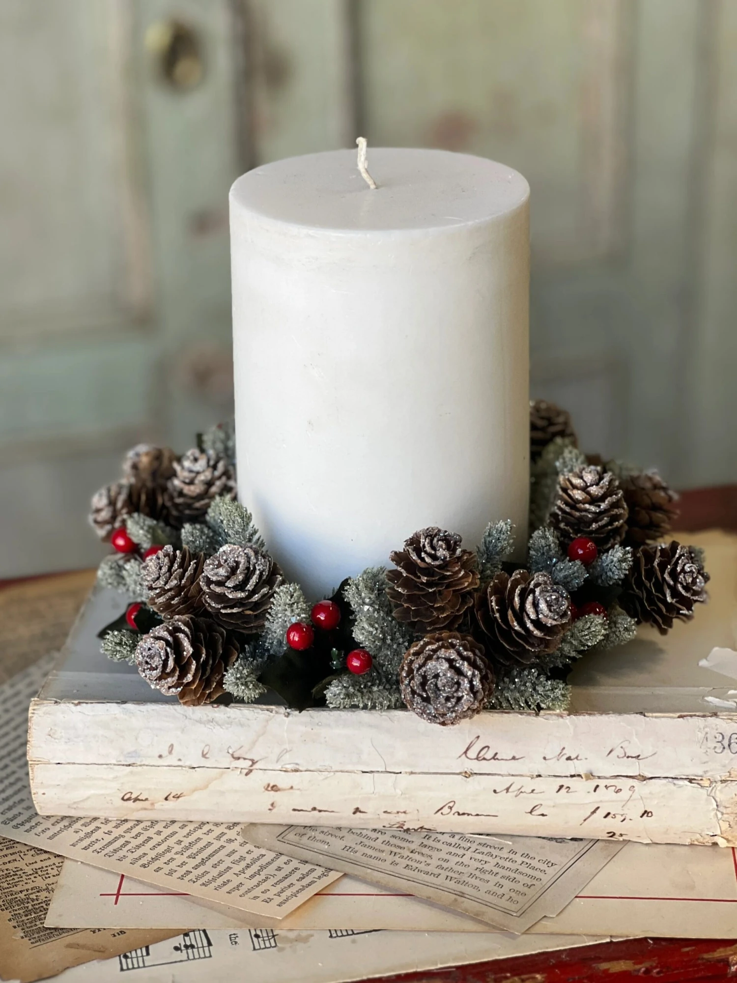 Popular and petite, the Icy Berries & Cone collection is a beautiful mix of pine, pine cones, red berries, and holly shaped leaves dusted with snow, glitter and mica for a wonderfully wintry effect.