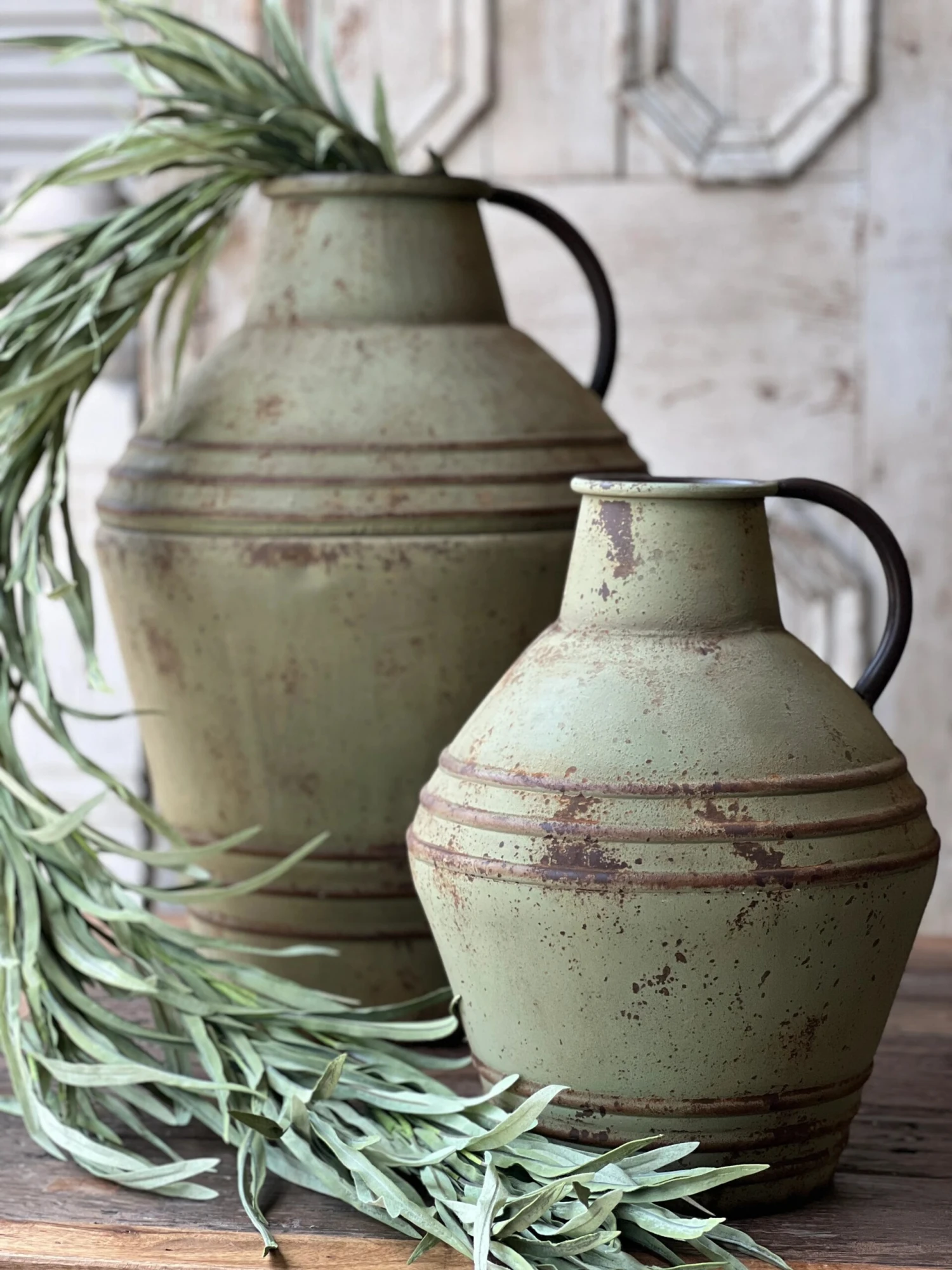 These gorgeous vessels are certain to make a statement with their distressed finish in lovely shades of tonal greens. ย They are extremely versatile and offer a myriad of styling options.