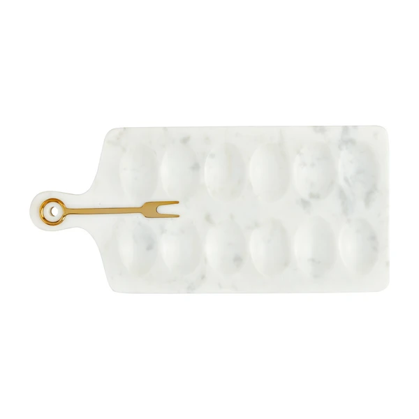 Elevate your entertaining experience with this exquisite Marble Devil Egg Serving Board, a sophisticated 2-piece set designed to impress. The elegant marble deviled egg paddle board provides a stunning backdrop for your culinary creations, measuring a generous 7″ x 15 1/4″ to accommodate a variety of appetizers. Accompanying the board is a beautifully crafted brass finished stainless steel fork, measuring 5 1/2″, perfect for serving with style and ease. The luxurious marble surface not only adds a touch of class to your table setting but also ensures durability and easy maintenance. Ideal for hosting gatherings or as a thoughtful gift for culinary enthusiasts, this set combines functionality with timeless elegance.