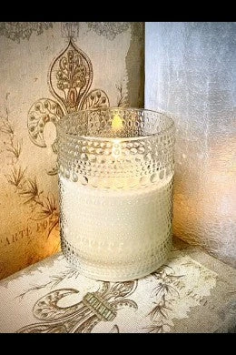 LED made of ivory wax, poured into an embossed glass jar. The LED flame technology creates an incredibly realistic and subtle flicker which glows approximately 250 hours per set of AA batteries.
