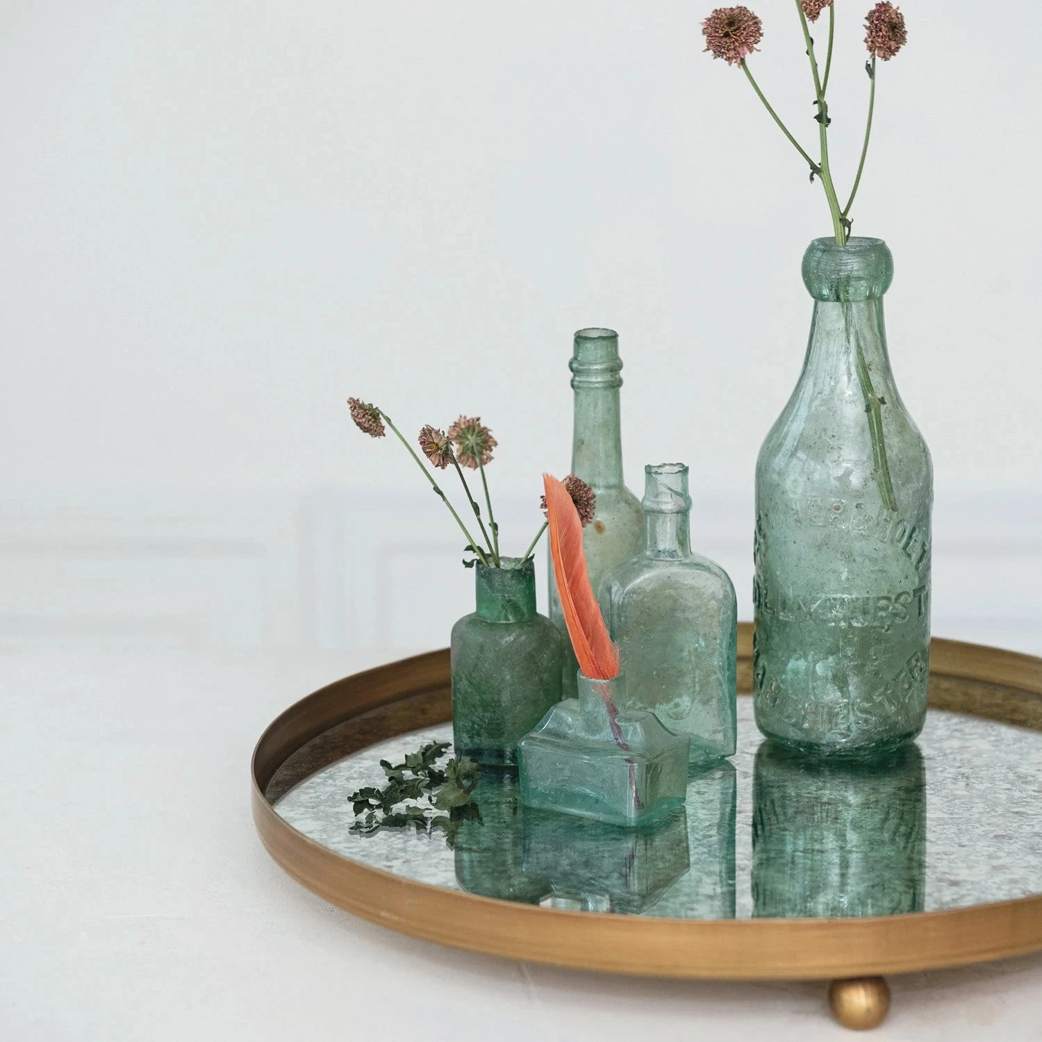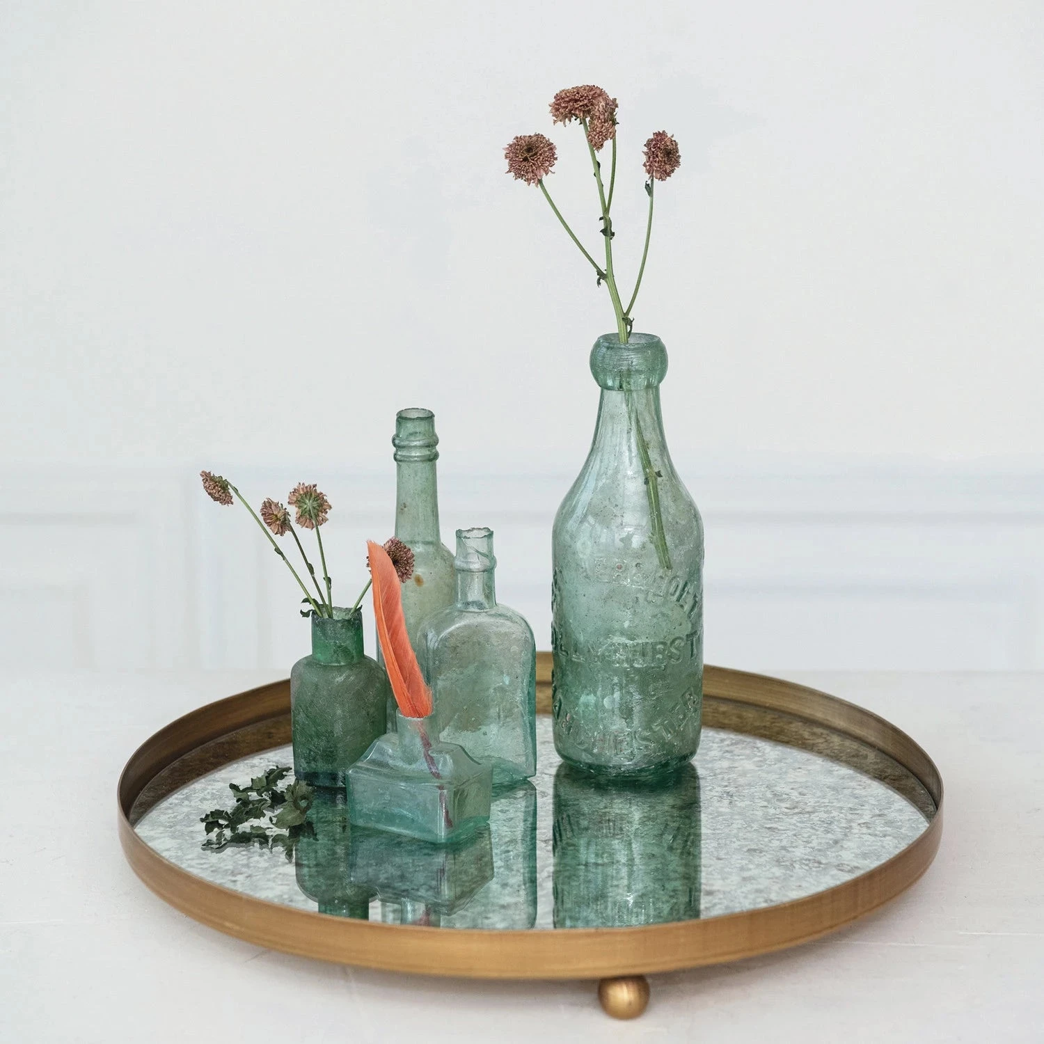 Round Decorative Metal Footed Antiqued Mirror Tray, Gold Finish