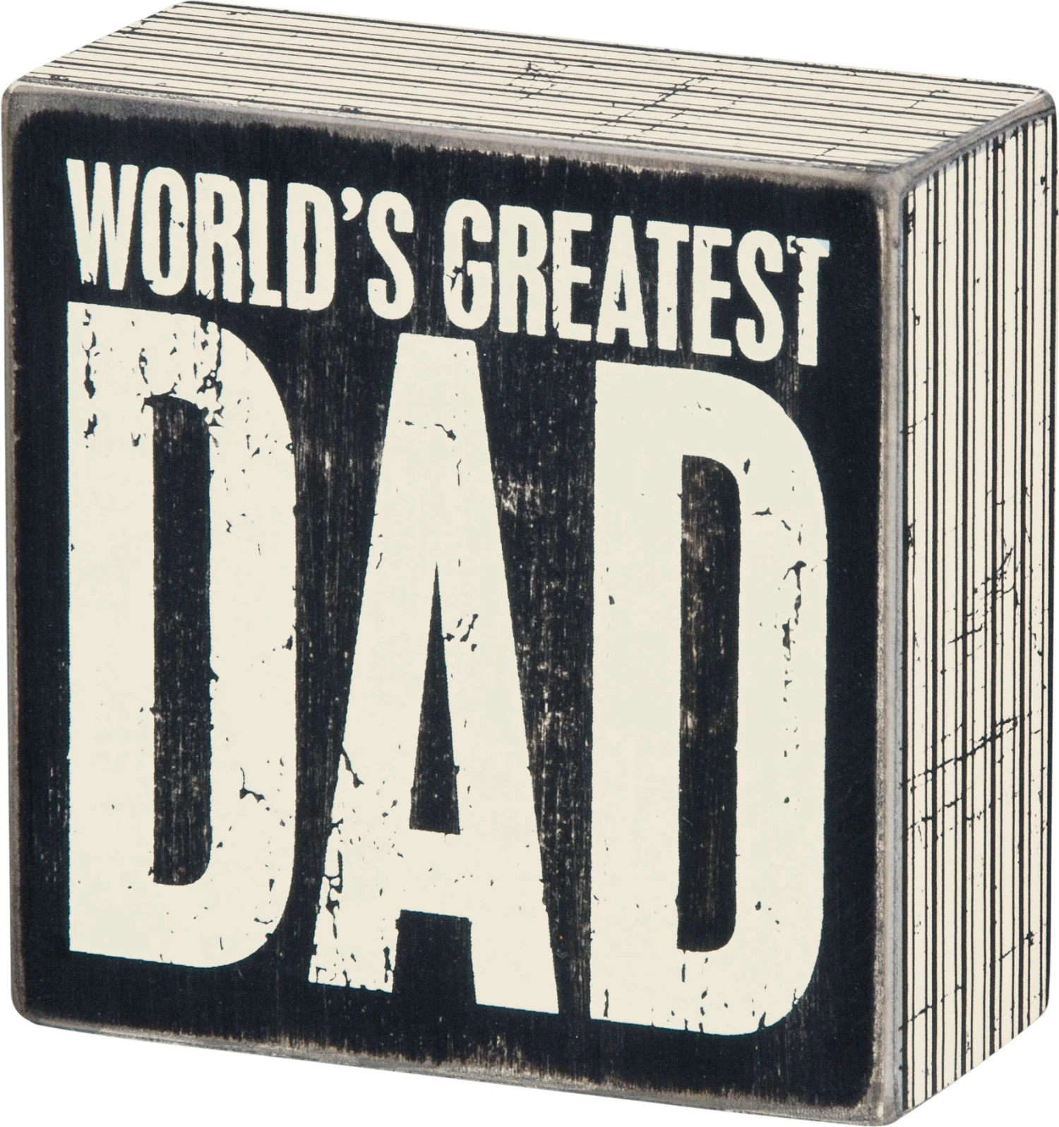 A classic black and white wooden box sign featuring a distressed “World’s Greatest Dad” sentiment with striped trim designs. Easy to hang or can free-stand alone.